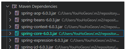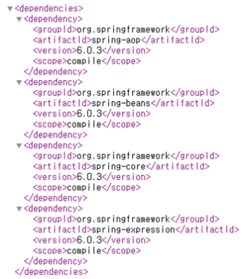spring-context만 추가하였음에도 불구하고, spring-context가 의존하는 다른 의존성도 함께 추가된다.