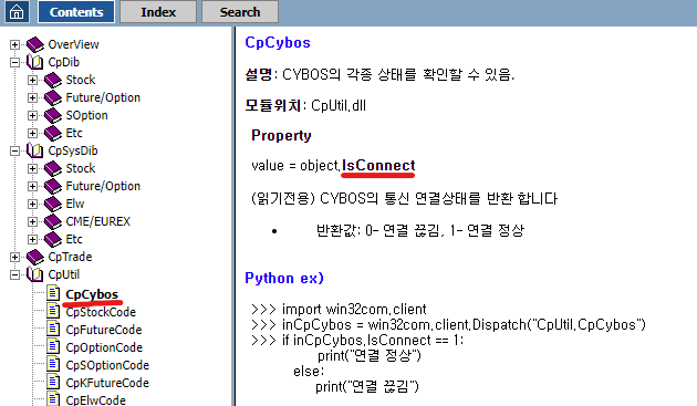 cpCybos의 isConnect 메서드를 통해 연결 상태를 확인할 수 있다.